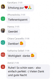 Wenn du magst, kannst du deine Kamera einschalten, so sehen wir uns gegenseitig. Oder du lässt sie einfach aus und genießt das Training ganz entspannt nur für dich. Beides ist vollkommen okay :)